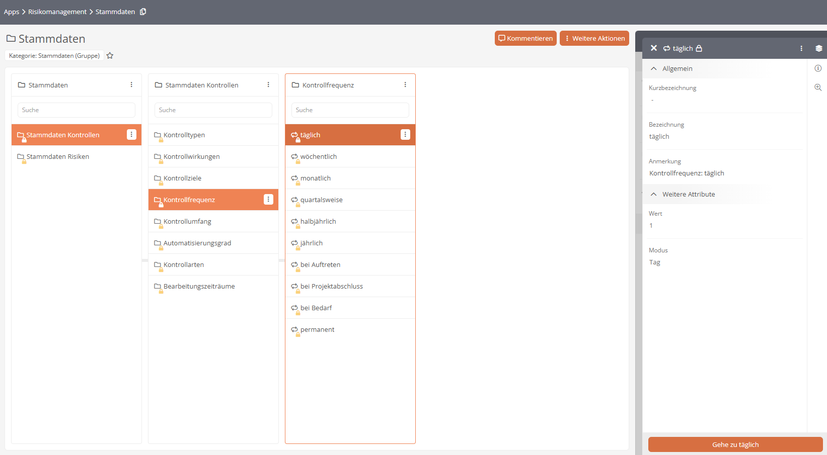 Hinweis: Auch für unregelmäßige Kontrollen (z. B. Bei Bedarf, Bei Projektabschluss, Bei Auftreten) sind im Stammdatenordner Kontrollfrequenz standardmäßig Intervalle hinterlegt. Wenn Sie Kontrollen nur punktuell durchführen, automatisieren Sie die Aufgaben nicht.