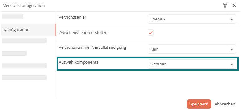 In der Versionskonfiguration einer Starttransition können Sie im Bereich Konfiguration über die Eigenschaft Auswahlkomponente festlegen, ob beim Erstellen einer Version der Dialog Objektauswahl angezeigt wird.