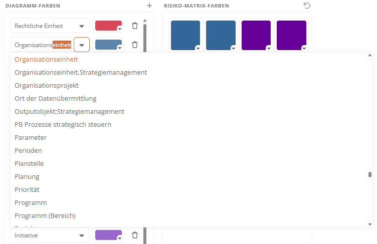 Im Bereich Diagramme können Sie in der Spalte Risiko-Matrix-Farben die Farbgebung für die einzelnen Flächen einer Risikomatrix bestimmen. Klicken Sie hierzu in der 4x4-Matrix auf eine Fläche, um die Farbe über den Editor anzupassen. Ihre benutzerdefinierte Farbgebung wird dann auf alle Risikomatrizen im Portal angewendet.