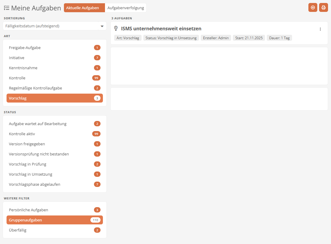 Im linken Bereich der Aktuellen Aufgaben können Sie per Klick auf Vorschlag oder Gruppenaufgabe nach dieser Aufgabe filtern.