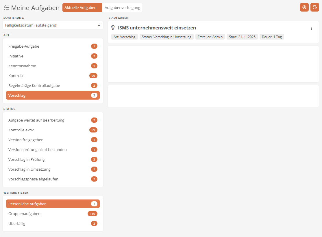 Im linken Bereich der Aktuellen Aufgaben können Sie per Klick auf Vorschlag oder Persönliche Aufgabe nach dieser Aufgabe filtern.