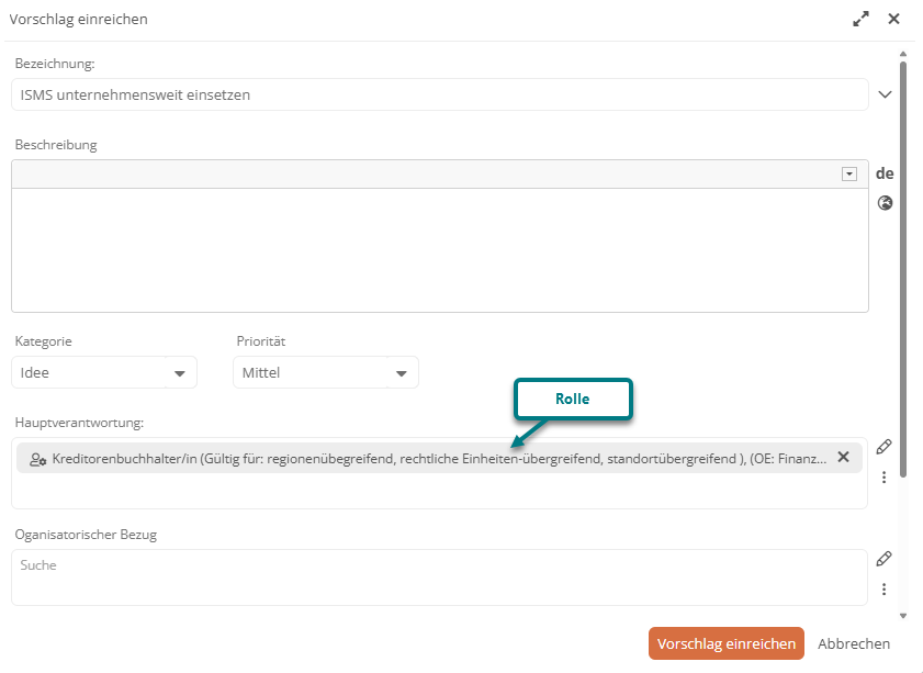 In der App Ideenmanagement können Sie Vorschläge im Attribut Hauptverantwortung standardmäßig folgenden Kategorien zuweisen: