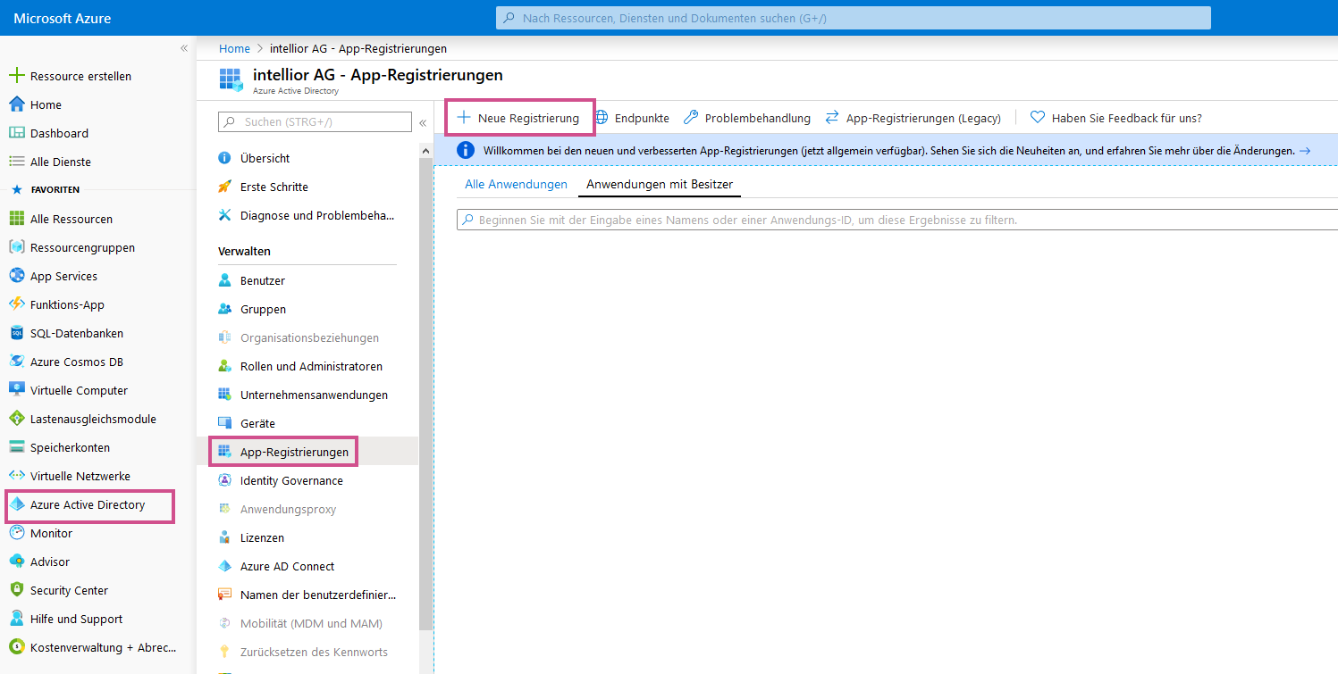 Fügen Sie in Microsoft Azure unter Azure Active Directory | App-Registrierung eine neue Registrierung hinzu: