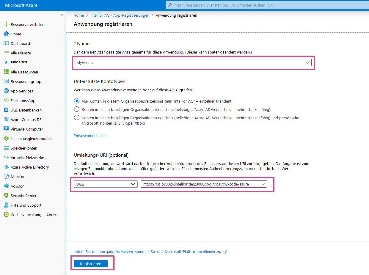 Um die Authentifizierung über Azure OAuth 2.0 einzurichten, registrieren Sie Aeneis zunächst über Microsoft Azure.