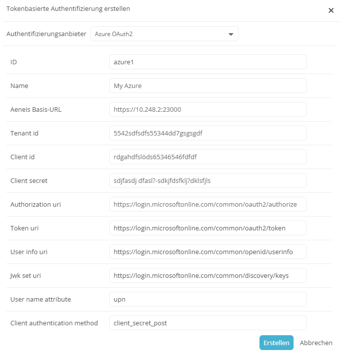 Um die Authentifizierung über Azure OAuth 2.0 in Aeneis einzurichten, erstellen und konfigurieren Sie in der ServerAdministration eine neue tokenbasierte Authentifizierung.