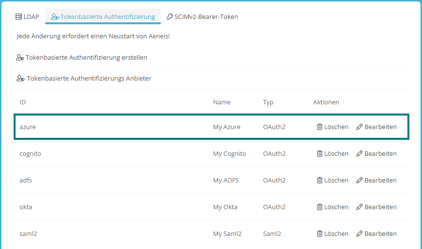 Die neu eingerichtete Authentifizierung erscheint in der Tabelle unter Tokenbasierte Authentifizierungsanbieter.