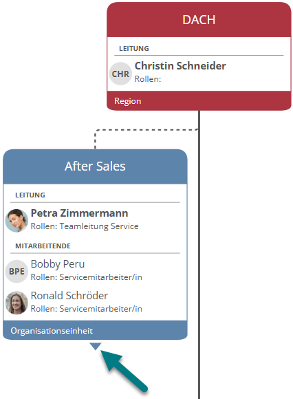 Wenn der Eintrag mit Ausklappen gekennzeichnet ist, können Sie per Klick die untergeordnete Ebene des Elements Ihrer Aufbauorganisation einsehen.