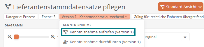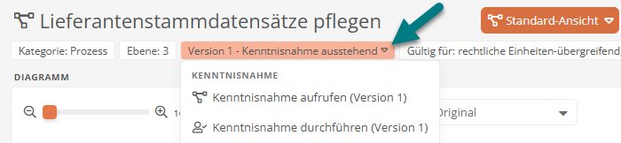 Klicken Sie auf die Versionsauswahl im Header des Objekts und dann auf den Eintrag Kenntnisnahme aufrufen: