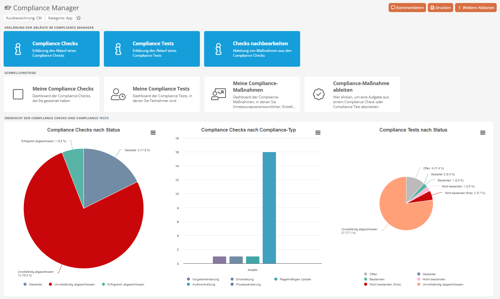 Zusätzlich unterstützt die separate Compliance Manager App das Management und die Prozessverantwortlichen dabei, alle Compliance-Aktivitäten zu analysieren und gezielt zu steuern.