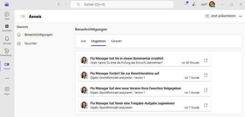 Mit der Aeneis App für Microsoft Teams integrieren Sie Benachrichtigungen und Ihre Favoriten aus Aeneis direkt in Ihre tägliche Zusammenarbeit.