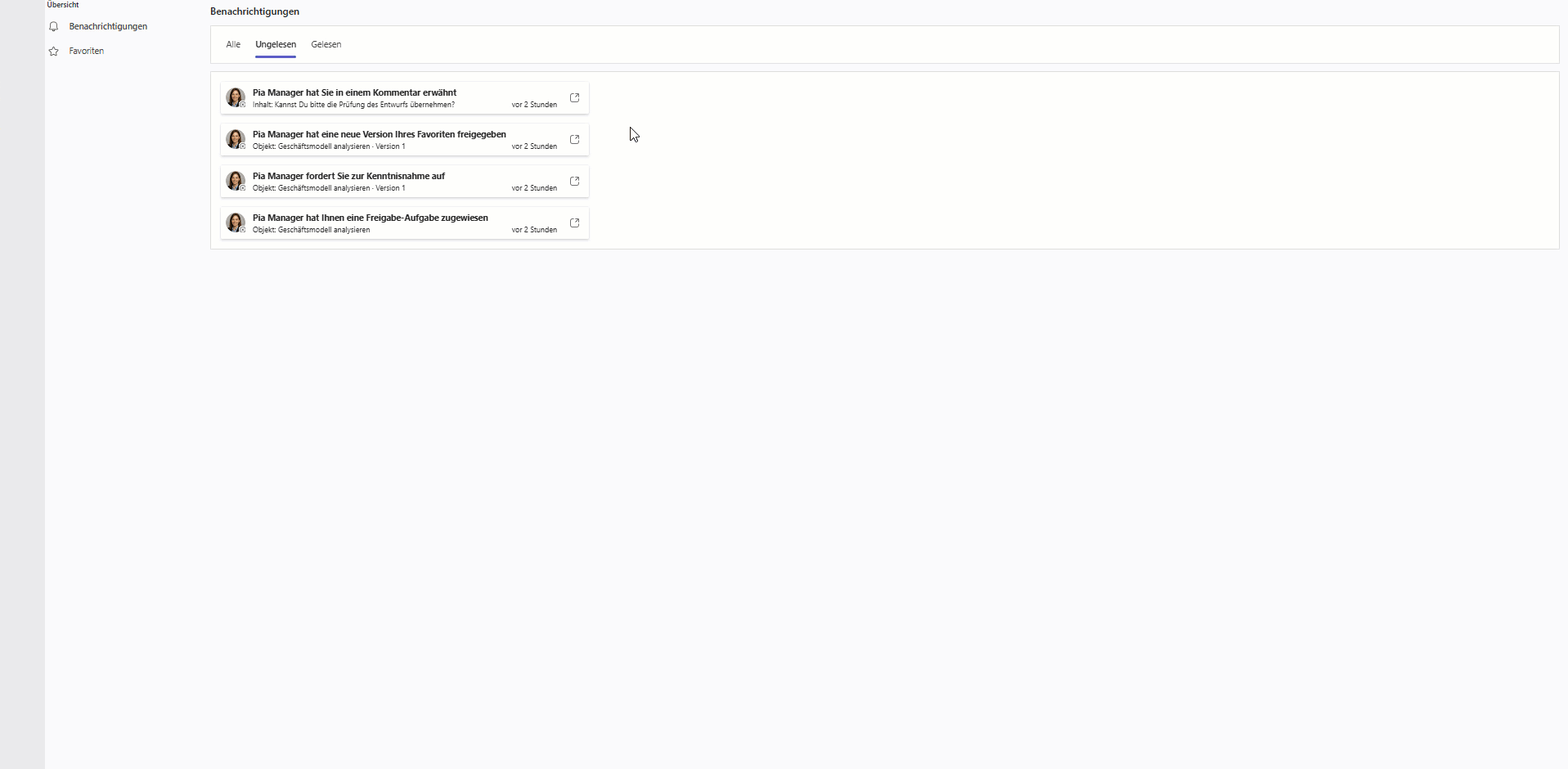 Im Bereich Benachrichtigungen der Aeneis-App für Teams sehen Sie alle Meldungen, unmittelbar nachdem sie in Aeneis ausgelöst wurden. Sie werden automatisch entfernt, sobald sie auch im Portal-Header nicht mehr sichtbar sind. Ebenso aktualisieren sich die Benachrichtigungen im Portal entsprechend, wenn Sie in Teams Benachrichtigungen aus Aeneis als gelesen markieren oder löschen. Über die Tabs können Sie jeweils gelesene und ungelesene Benachrichtigungen separat ansehen. Per Klick auf eine Benachrichtigung gelangen Sie direkt zum jeweiligen Auslöser im Portal.