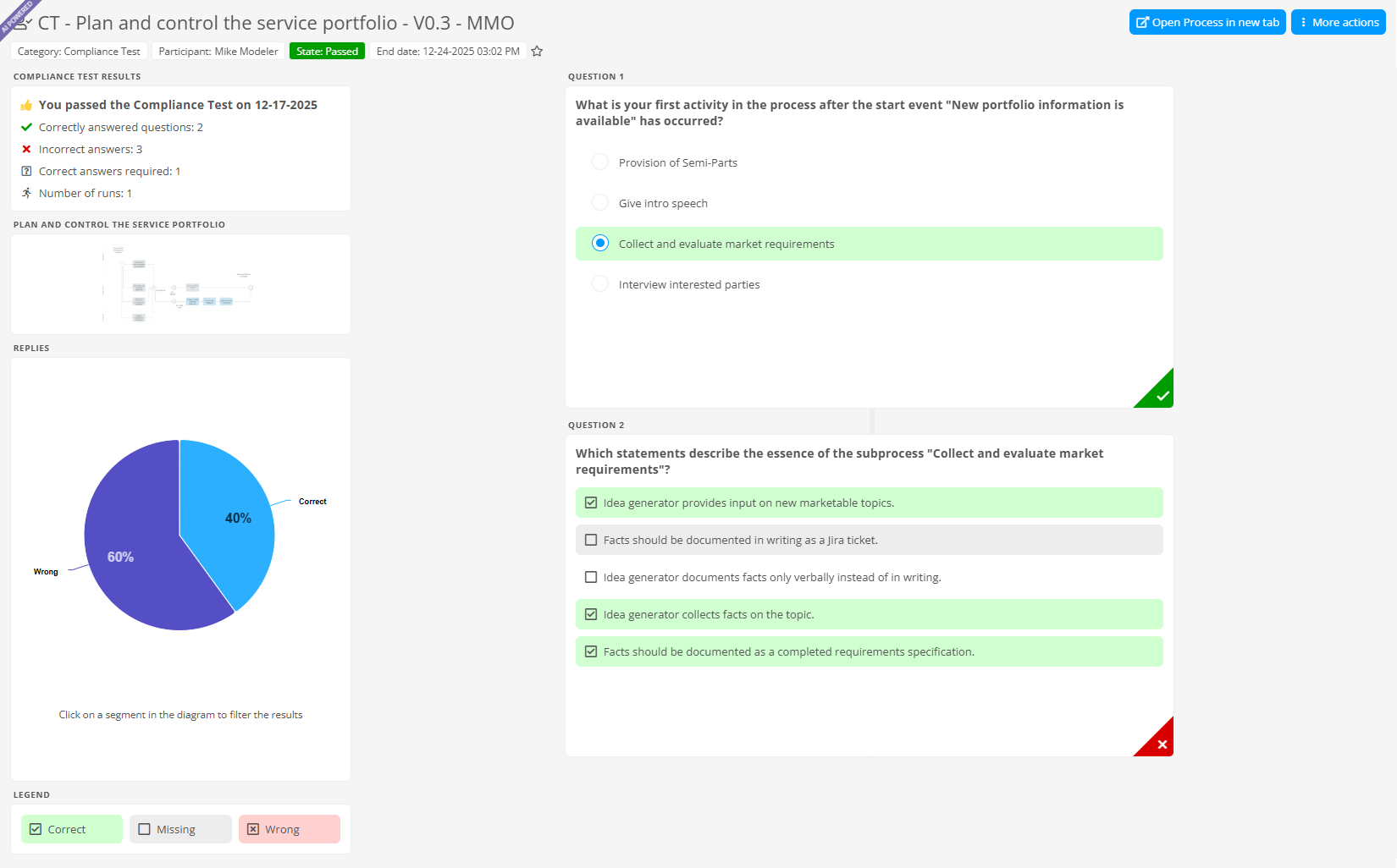 Only when the participant has passed the Compliance Test is the relevant content of the object deemed to have been successfully acknowledged. The Compliance Check is considered complete when all participants have successfully completed the Compliance Test. Aeneis documents the results and current status of the Compliance Checks and tests in separate detailed views.