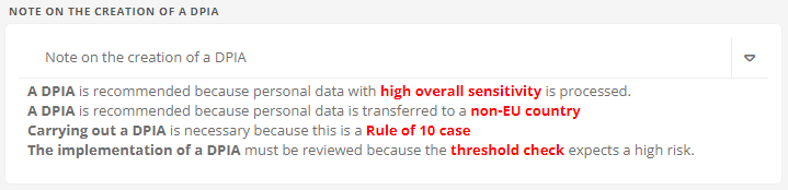 In the Default view of a processing activity, you can see whether Aeneis recommends carrying out a Data Protection Impact Assessment (DPIA) in the section Note on the creation of a DPIA.