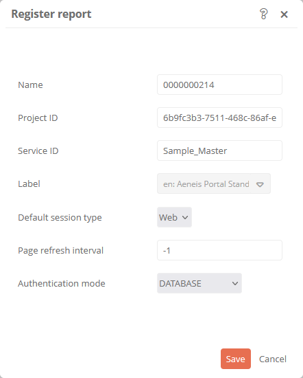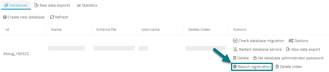 Note: If only one Portal report is stored in a database, the Register report dialog opens directly after you have clicked on Report registration in the Actions column.