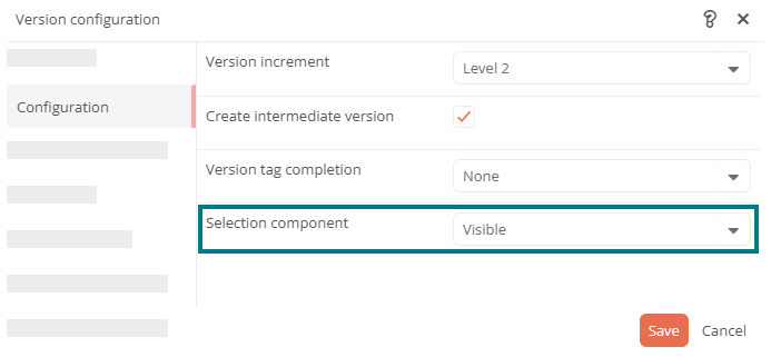 In the version configuration of a start transition, you can use the Selection component property in the Configuration area to specify whether the Object selection dialog is displayed when a version is created.