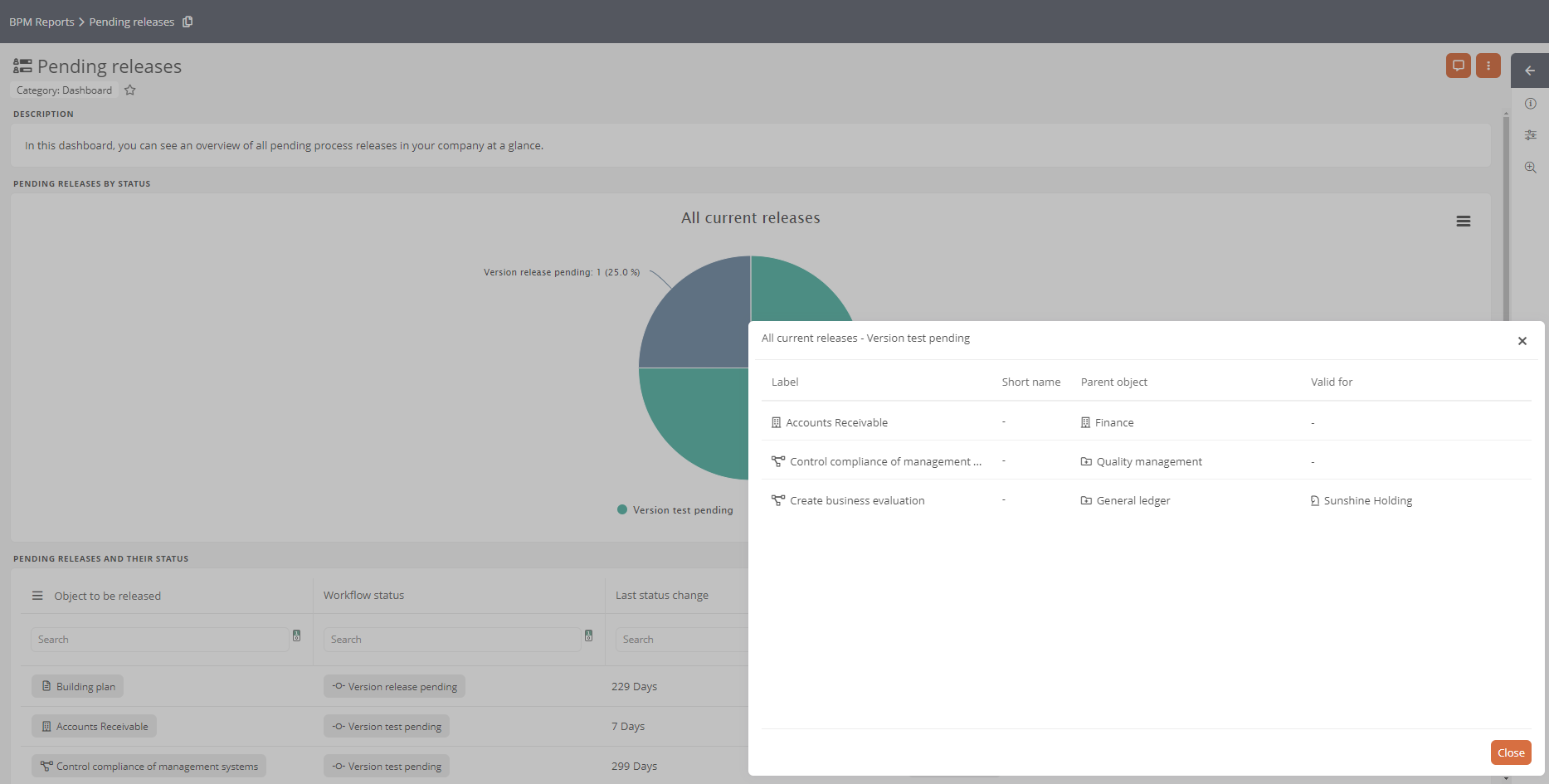 Pending releases: All objects that are in ongoing release processes are evaluated and displayed here. See also chapter Monitor pending releases.