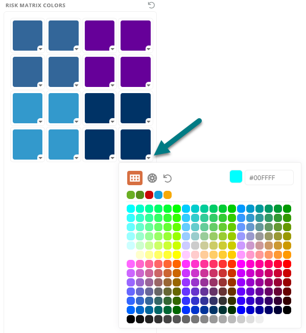 In the Risk matrix colors column in the Diagram area, you can determine the coloring for the individual tiles of a risk matrix. To do this, click on a tile in the 4x4 matrix to adjust the color using the editor. Your custom coloring is then applied to all risk matrices in the Portal.