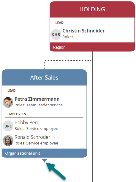 Managers and employees are displayed with their roles in the respective shape. Employees who only belong to the respective unit on a technical basis are issued in the technical assignment area: